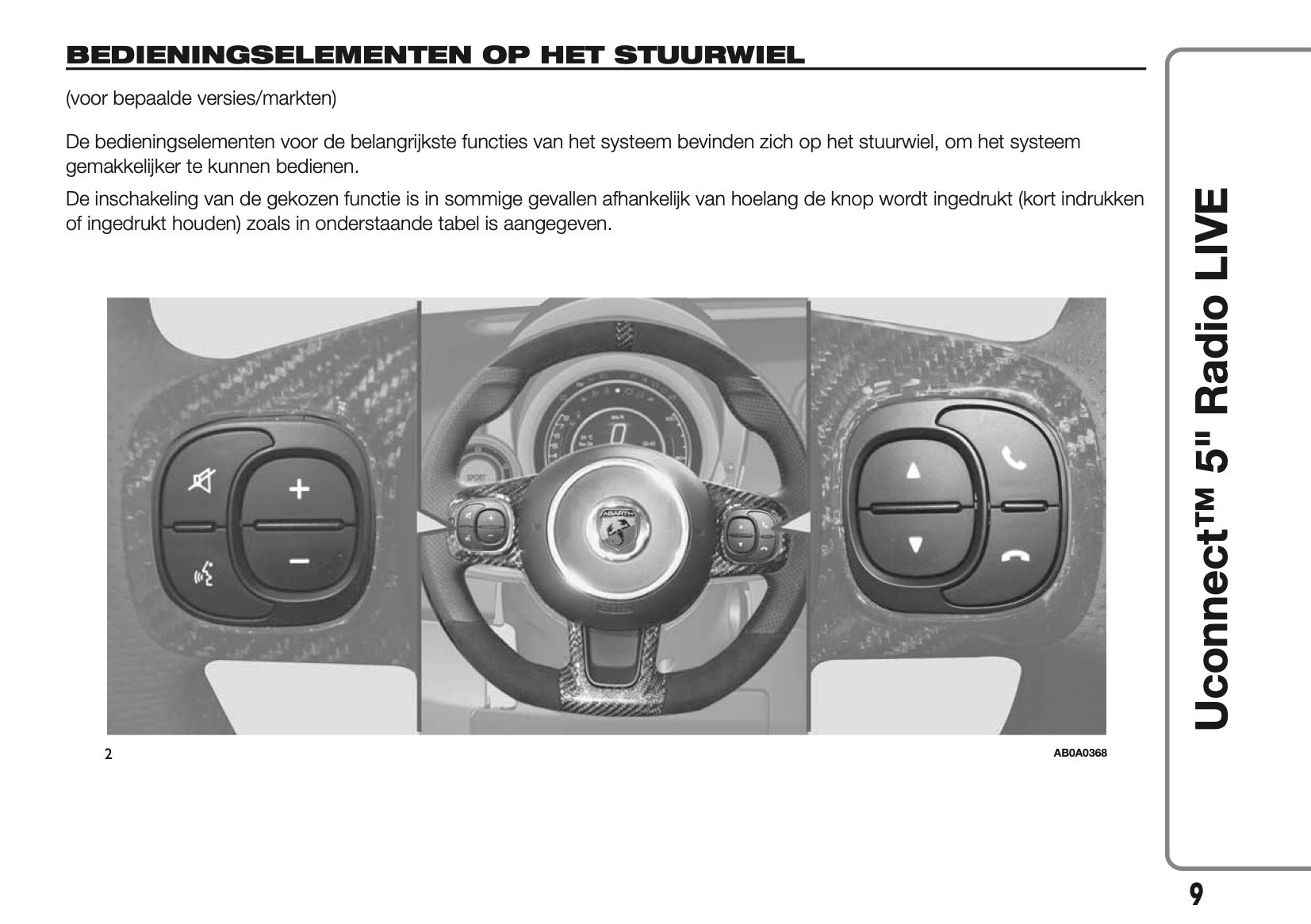 Deze 56 pagina's tellende Nederlandstalige infotainment handleiding, op aanvraag afgedrukt, biedt uitgebreide instructies voor uw Abarth 500/595/695 Uconnect 50 Radio.