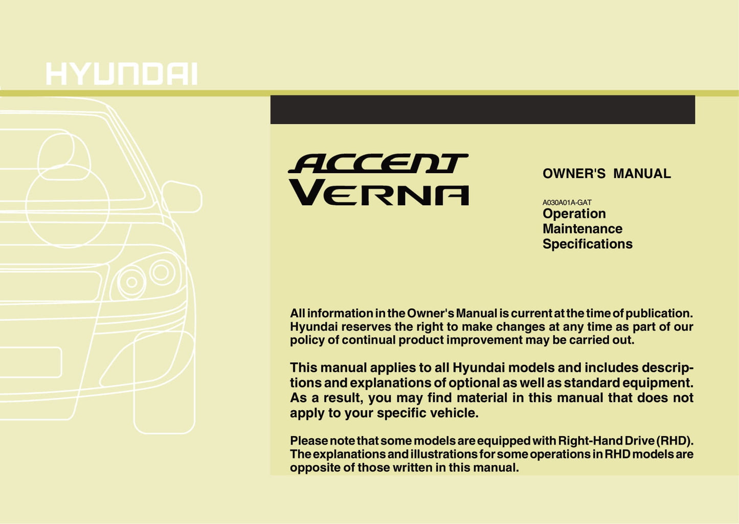 Deze 284 pagina's tellende Engelstalige autohandleiding, op aanvraag gedrukt, biedt uitgebreide instructies voor uw Hyundai Accent-voertuig.